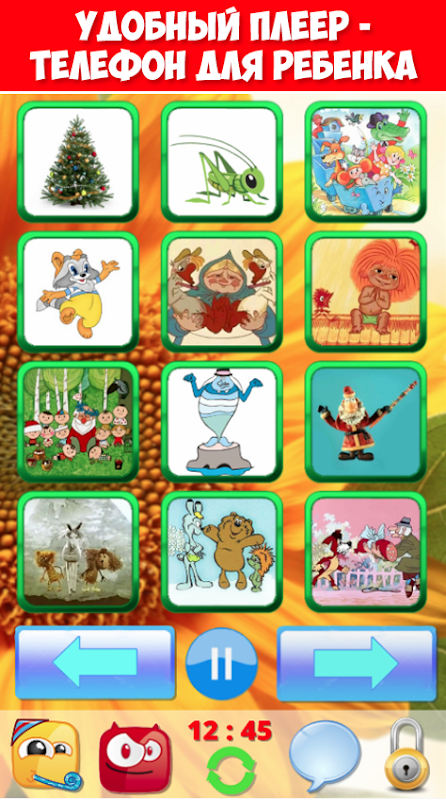 Lieder für Kinder und Kleinkinder – kostenlos und ohne Internet! Große Auswahl an Kinderliedern aus sowjetischen Zeichentrickfilmen. Sie sind erfüllt von der Freundlichkeit und Fürsorge dieser Zeit. Sieht aus wie ein Kindertelefon, die Tasten sind Bilder von Liedern