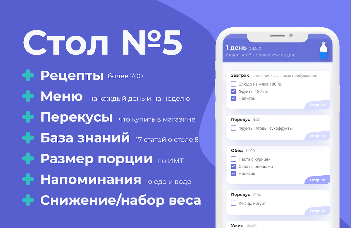 Mehr als 700 Rezepte, viele Menüoptionen für jeden Tag mit Alternativen, eine automatische Einkaufsliste für den Laden, eine durchsuchbare Dose/Kann-Sektion, 17 ausführliche Artikel zu Tabelle #5 von Ernährungswissenschaftlern und Gastroenterologen, eine Erinnerung ans Wassertrinken.