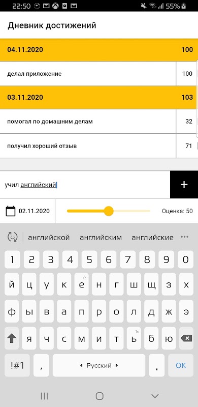 Verwenden Sie diese App, um alle Ihre Erfolge aufzuzeichnen und diesen Erfolg von 0 bis 100 zu bewerten.
