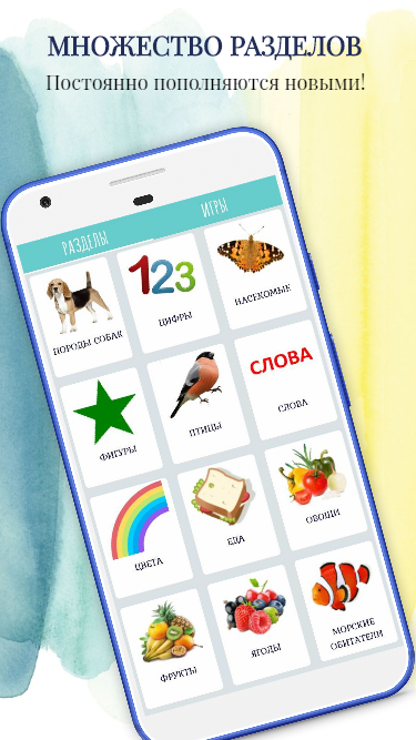 Speisen, Gemüse, Obst, Beeren, Meerestiere, Möbel, Haushaltsgeräte, Blumen, Musikinstrumente, Wilde Tiere, Haustiere, Kleidung, Transport, Haushalt, Figuren, Insekten, Formen, Wörter, Farben, Vögel.