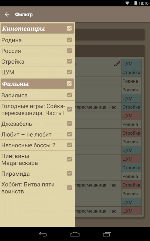Приложение собирает расписания сеансов кинотеатров Северодвинска и показывает их в виде сводной таблицы. Результат можно фильтровать как по названию фильма, так и по названию кинотеатра. По долгому нажатию на элемент списка главного меню можно получить информацию о фильме или контакты кинотеатра.