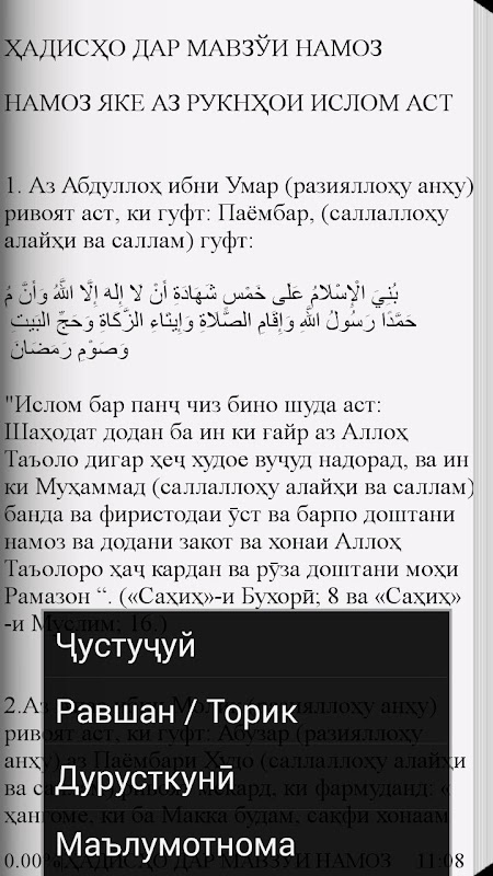 Ҳadisҳo Geschenk mavzӯҳoi:Ruza, Namozov, zakot, ҳaҷ, tavҳid aқida Inseln.BӮSTONI ҲADIS