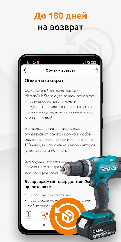 Die offizielle Anwendung „MasterClub.Store“ ist ein einzigartiger Ort zum Kauf von Waren berühmter Marken wie DEWALT, MAKITA, BOSCH, INTERSKOL, MILWAUKEE, GROHE, GEBERIT, GREENWORKS, KARCHER und mehr. Große Auswahl an Sanitärarmaturen, Werkzeugen, Haushaltsgeräten für den Haushalt und Gartengeräten für den Garten.