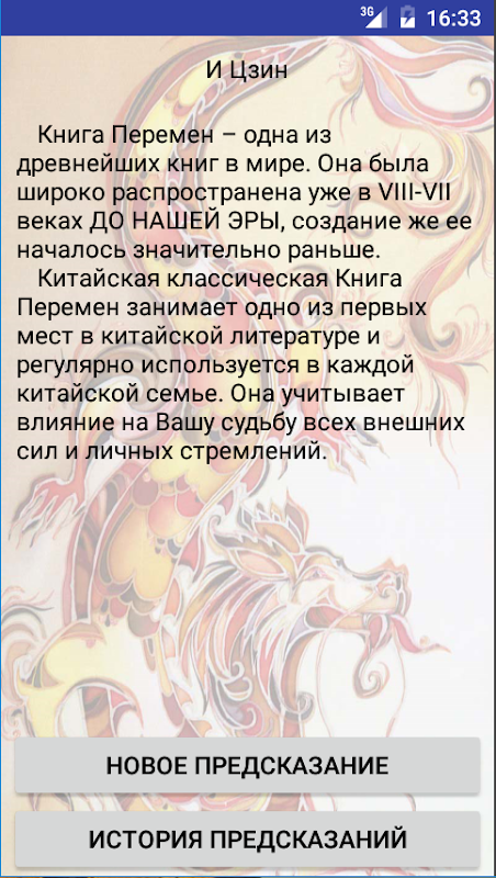I Ging - das früheste der chinesischen philosophischen Texten (.. 700 vor Christus), für die Weissagung soll, besteht aus 64 Hexagrammen. Jede Hexagrammen drückt eine bestimmte Lebenszeit Situation aus der Sicht seiner allmählichen Entwicklung. Buch der Wandlungen ermöglicht es Ihnen, in die Vergangenheit zu schauen, verstehen die Gegenwart und die Zukunft zu sehen.