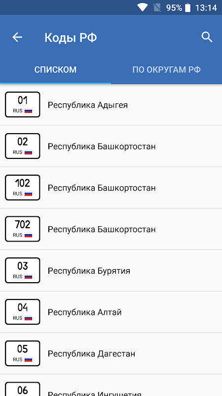 ✔ Eine praktische Referenz, in der Sie auch herausfinden können, zu welcher Region der gesuchte Code gehört. Die Informationen werden in Form einer Liste angezeigt, in der sowohl nach dem digitalen Code als auch nach dem Namen der Region gesucht werden kann. Außerdem können die Codes für die Bezirke der Russischen Föderation angezeigt werden.