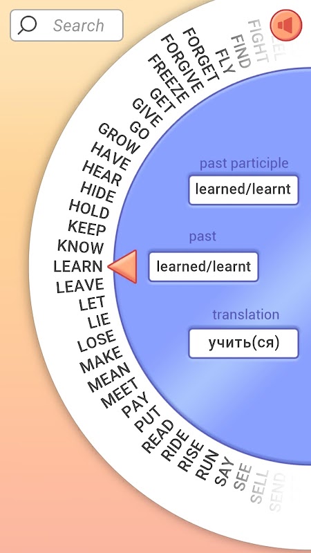 - Die Liste der Verben wird in Form einer rotierenden Scheibe (Spinner) dargestellt.