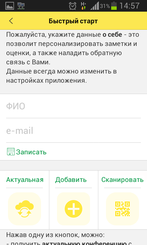 Die Anwendung speichert alle die Geschichte auf Konferenzen, die der Benutzer besucht hat - mit einem detaillierten Programm, persönliche Ergebnisse der Abstimmung über die Berichte und Bewertungen über sie.