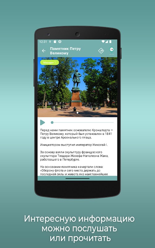 Laden Sie die Karte im Voraus herunter, um die App offline zu nutzen, oder wählen Sie einfach eine der vorgeschlagenen Routen und erkunden Sie die Stadt. Die Aufnahme wird abgespielt, sobald Sie sich der Sehenswürdigkeit nähern. Stoppen Sie die Aufnahme jederzeit oder hören Sie noch einmal zu. Ihr Spaziergang wird informativ und spannend sein! Jetzt enthüllt die Stadt Kronstadt ihre Geheimnisse für Sie.