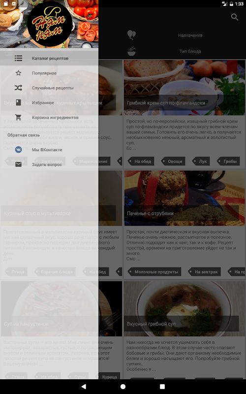 🍔 Быстрые переходы между группами рецептов по тегу (все рецепты разбиты на категории, поиск осуществляется в один миг)