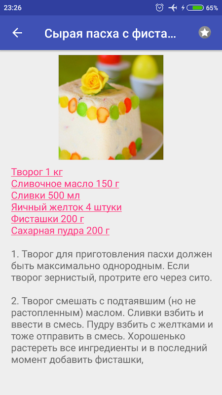 Вкусную сдобу - кулич, традиционно готовят на Пасху и пекут цилиндрической формы, украшая сверху глазурью и цукатами. Тесто для кулича используют дрожжевое. В нем всегда много яиц, сливочного масла и сахара. Рецепт пасхального кулича довольно простой, но считается, что выпечка получится высокой и сдобной, если готовить ее только со светлыми мыслями. Вкусные куличи получаются, если добавить в них изюм, орехи и ванилин. Перед подачей на праздничный стол их обязательно украшают сахарной пудрой, глазурью, цукатами, подкрашенным пшеном, шоколадной крошкой или кондитерской помадкой. Кулич — это мирской вариант церковного артоса, большого квасного хлеба, который выпекался в печи. Сегодня для этого подойдет любая домашняя духовка.
