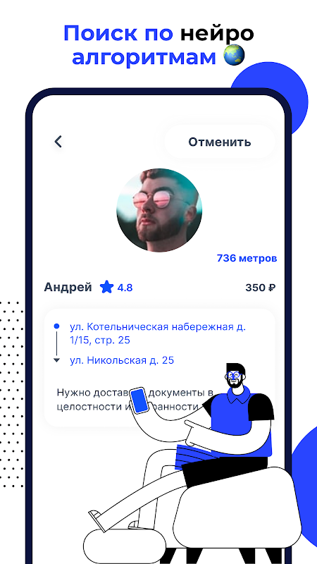 Nachdem Sie den nächstgelegenen Kurier in der Nähe gefunden haben, wird die Bestellung wirksam. Sie können den Kurier anrufen, wenn Sie Fragen haben, oder die Bestellung bei Kontaktverlust oder aus persönlichen Gründen stornieren. Die Zahlung an den Kurier erfolgt in bar oder per Karte. Bewerten Sie nach erfolgreichem Abschluss der Bestellung unbedingt die Arbeit des Kuriers - diese Überprüfung hilft bei der Regulierung der Bewertung und der Arbeit des Kuriers. Danke für Ihre Aufmerksamkeit!