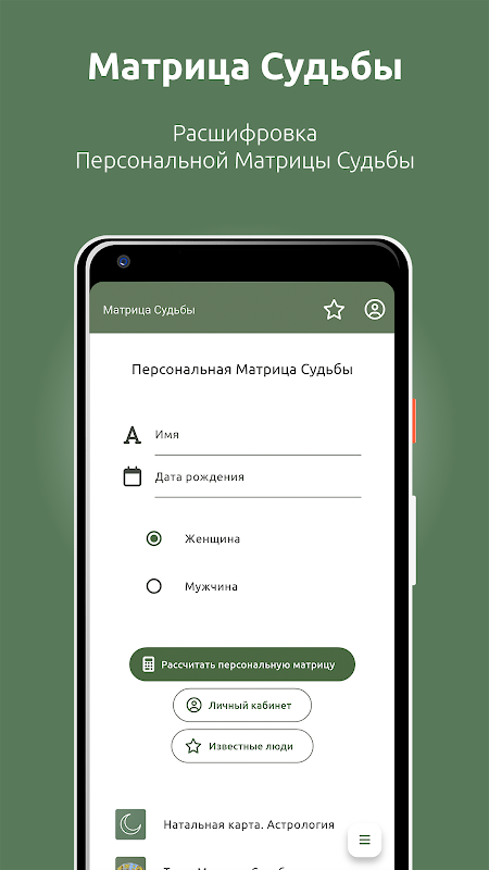 Um die Schicksalsmatrix zu erhalten, müssen Sie das Geburtsdatum und den Namen eingeben. Basierend auf diesen Daten führt die Anwendung Berechnungen durch und zeigt dem Benutzer eine fertige Schicksalsmatrix an, die die Schlüsselmomente des Lebens, Entwicklungsrichtungen und mögliche Hindernisse anzeigt.