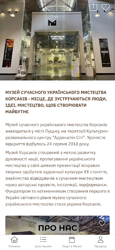 Willkommen zur offiziellen Bewerbung des Korsaki-Museums für moderne ukrainische Kunst. Das Museum befindet sich in der Stadt Luzk, auf dem Gelände des Kultur- und Unterhaltungszentrums Adrenaline City.