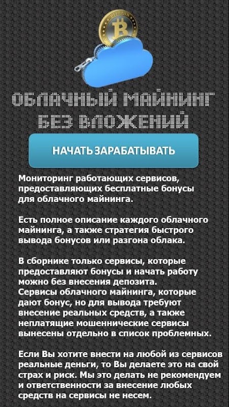 В сборнике только сервисы, которые предоставляют бонусы и начать работу можно без внесения депозита. Сервисы облачного майнинга, которые дают бонус, но для вывода требуют внесение реальных средств, а также неплатящие мошеннические сервисы вынесены отдельно в список проблемных.