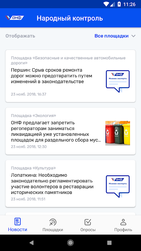 После установки у Вас появится возможность участвовать в опросах, мониторингах, рейдах и акциях по 12 тематическим площадкам. Для Вас станет доступна информация об основных направлениях деятельности тематических площадок и главные новости ОНФ.