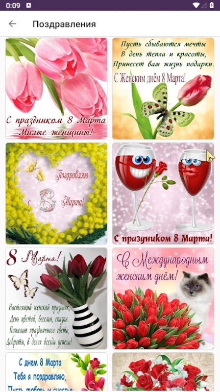 Derzeit enthält die Bewerbung Bilder und Postkarten für den 8. März (Internationaler Frauentag).