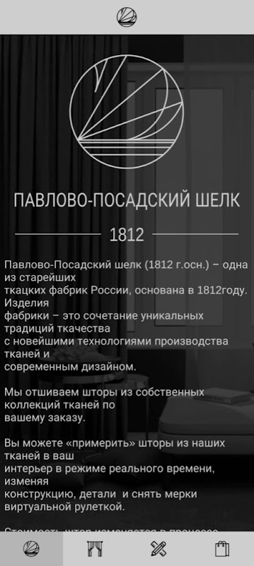 Павлово-Посадский шелк (1812 г.осн.) – одна из старейших ткацких фабрик России, основана в 1812 году. Изделия фабрики – это сочетание уникальных традиций ткачества с новейшими технологиями производства тканей и современным дизайном. Мы отшиваем шторы из собственных коллекций тканей по вашему заказу. Вы можете «примерить» шторы из наших тканей в ваш интерьер в режиме реального времени, изменяя конструкцию, детали и снять мерки виртуальной рулеткой. Стоимость штор изменяется в процессе проектирования в нашем приложении.