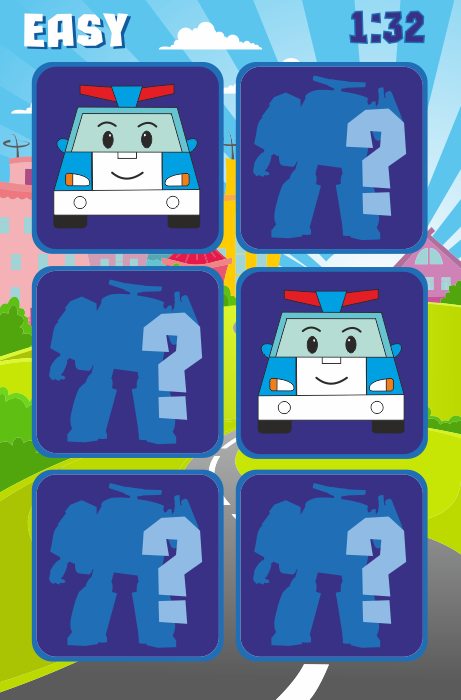 Игра Память Поли РоботКар (робокар) - популярная игра для тестирования памяти, которая заключается в нахождении пары одинаковых карточек на поле разных размеров. На карточках вы узнаете персонажей популярного мультфильма «Поли Робокар» - Поли, Эмбер, Хэли, Рой, Спуки, Брунер. Игра Память Поли РоботКар (робокар) - это тренировка памяти для всей семьи. Различные уровни сложности, яркий интерфейс, любимые герои.