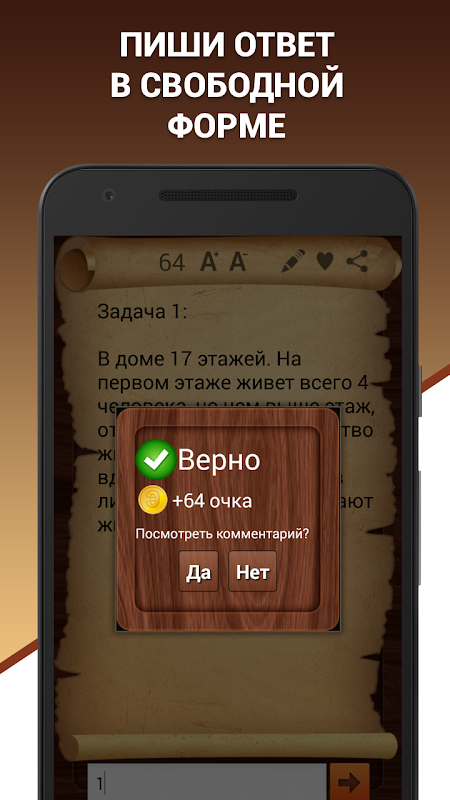 Der wesentliche Unterschied zwischen diesem intelligenten Spiel für Erwachsene auf der anderen Seite, dass die Anwendung in einer halben Logik-Puzzles auf dem Abzug kann in freier Form beantworten. Zum Beispiel: "Was wiegt mehr" oder "In welche Richtung die Flagge fliegt." Zunächst für die richtige Antwort aus dem ersten Mal, wenn der Benutzer 64 Punkte bekommt, aber nach jeder falsche Versionsnummer von Bonus von 2 mal reduziert.