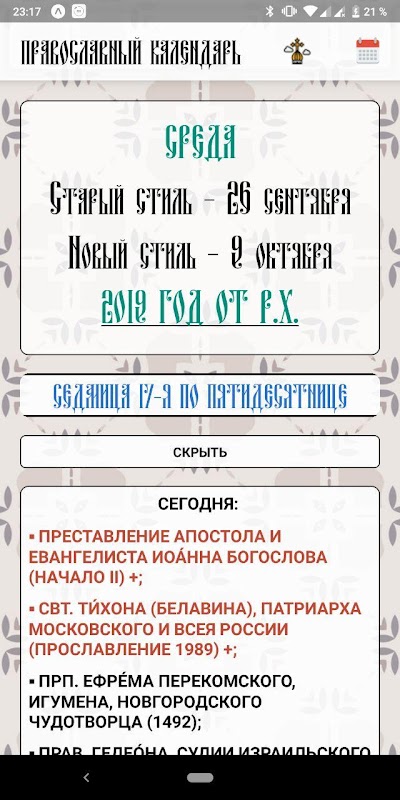 В приложении "ПРАВОСЛАВНЫЙ КАЛЕНДАРЬ" можно посмотреть не только информацию по сегодняшнему дню, но и выбрать интересующую дату. Кроме того, можно посмотреть список на целый год: