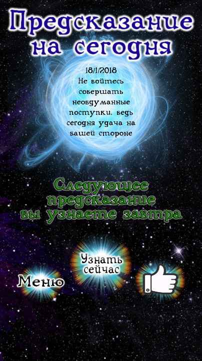 Вы когда-нибудь хотели узнать своё будущее? Что вас ждёт? Что приготовила вам судьба? Любовь и счастье? Славу и богатство? Успех и радость? Что вас ждёт в 2018 году? Тогда скачайте наш тест и узнайте своё будущее! Каждый день вы можете узнавать что вас ждёт завтра и узнавать свою судьбу. Заходите и узнавайте что вас ждёт!