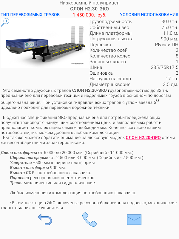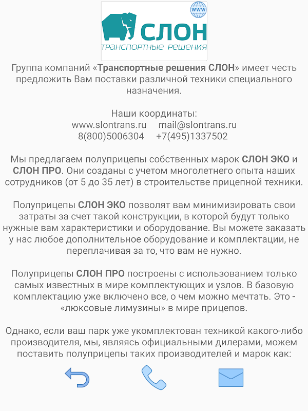 Приложение содержит обновляемый каталог тяжёлых полуприцепов СЛОН грузоподъемностью от 10 до 100 тонн с ценами и техническими характеристиками.