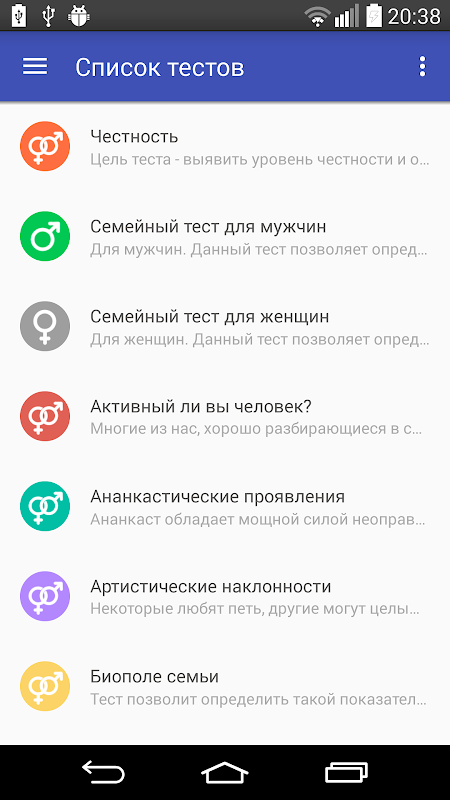 "Психологические тесты" представляет собой сборник из множества разнообразных тестов в одном бесплатном приложении для людей различного возраста и пола. Используя тесты узнайте все о своей личности, чувствах, отношениях, карьере. Вы получите ответы на давно мучившие Вас вопросы. С их помощью Вы сможете составить достаточно полную картину о личности интересующего Вас человека.