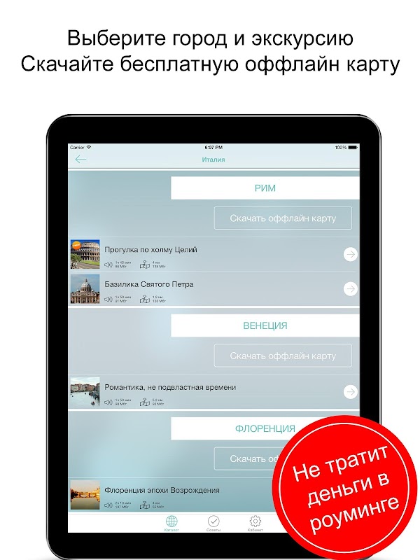 + Auf eine Reise gehen, eine Tour wählen, besuchen möchten. Pumped ausgewählte Tour. Das ist alles! Jetzt können Sie entlang der Route gehen, hören Sie die interessantesten Informationen über Ihren Wohnort, siehe Fotos und historische Materialien, die Karte zu verwenden. Führung - nur ein paar Dollar. Und Sie nicht über eine Internetverbindung während der Tour benötigen.