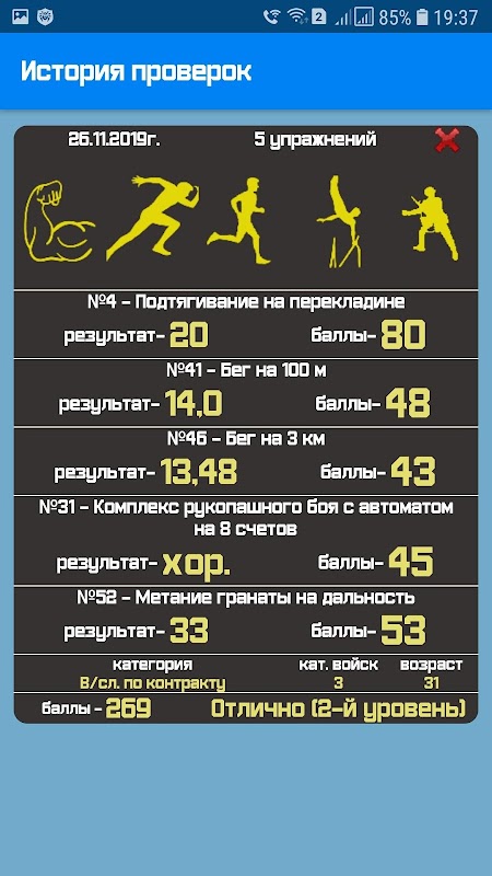 Es ist möglich, die Ergebnisse der Übungen, die Anzahl der Punkte und die Noten für die körperliche Prüfung zu speichern. Diese Daten finden Sie im Abschnitt "Verlauf prüfen".