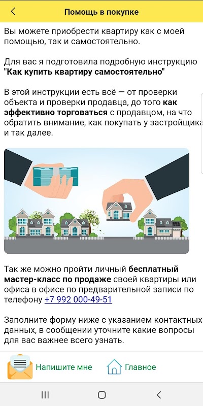 Меня зовут Олеся Русакова, я специалист по недвижимости в Екатеринбурге. Это мое личное приложение. Если вам нужен риелтор - устанавливайте, смотрите и обращайтесь!