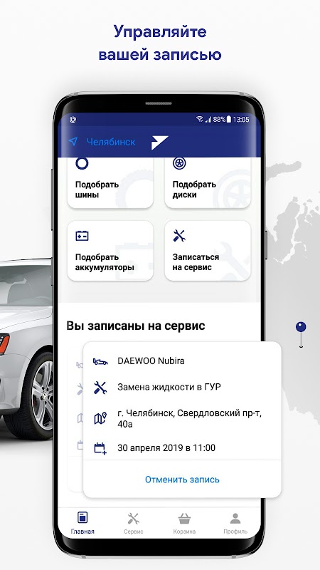 • Быстро записаться на шиномонтаж или другие услуги сервиса: выберите услугу, автосервис и время для посещения.