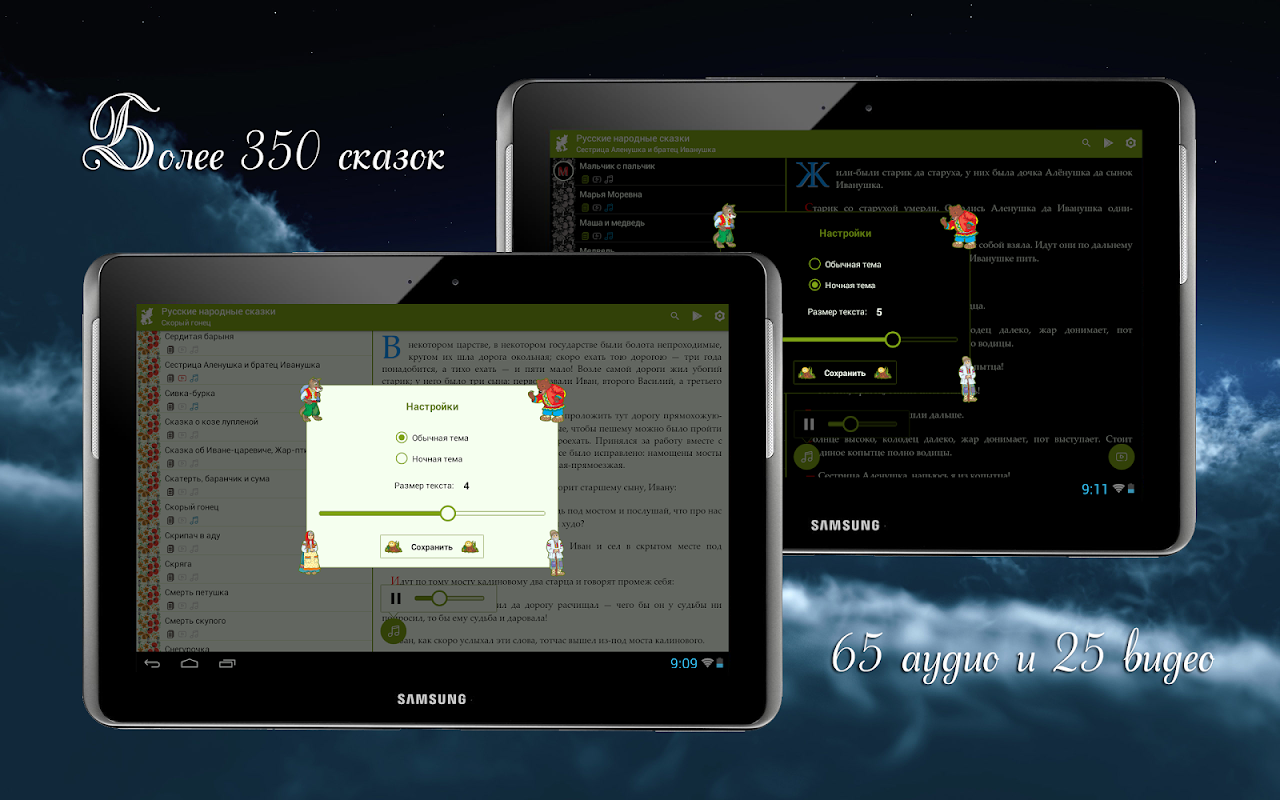 |> Возможность прослушивания та просмотра некоторых из сказок.