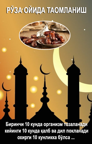 Приложение о том как правильно питаться во время Рамадана. Ушбу илова орқали сиз Рамазон ойида қандай овқатланиш кераклигини билиб оласиз. Тўғри овқатланиш - соғлиғингиз гаровидир!