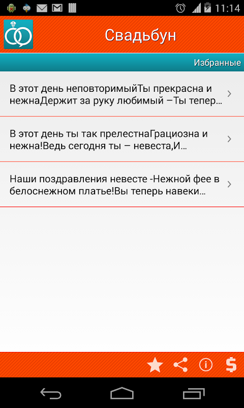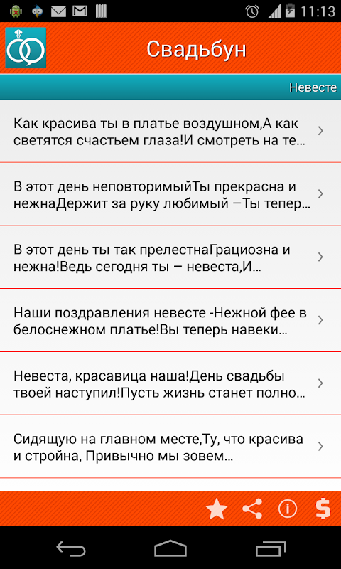 Из приложения можно посылать смс или e-mail с выбранным поздравлением жениху и невесте. Можно очень быстро найти подходящий тост для себя и для соседа.