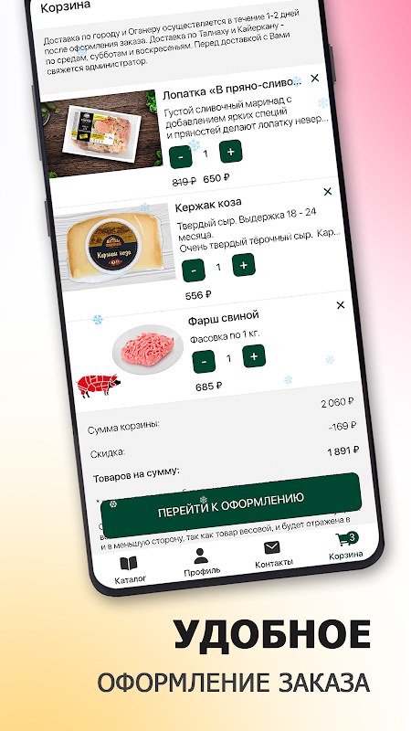 Unsere Anwendung „Demidov Products“ bietet den Bewohnern von Norilsk eine bequeme und zuverlässige Möglichkeit, frisches und hochwertiges Fleisch und Fisch direkt nach Hause zu bringen. Wir arbeiten mit zuverlässigen Lieferanten zusammen, die die Frische und Sicherheit jedes Produkts garantieren.