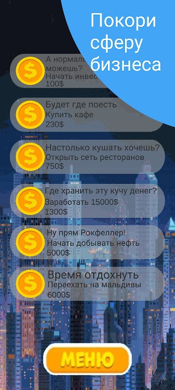 In diesem spannenden Spiel musst du der reichste Mann der Welt werden. Mit Ihren Geschäftsideen können Sie die ganze Welt erobern, ausgehend von Ihrer kleinen Stadt gelangen Sie schließlich zum Mars! Indem Sie auf die Schaltfläche klicken, passive Upgrades und Upgrades auf Knopfdruck kaufen und Erfolge erzielen, erreichen Sie Ihr geschätztes Ziel.