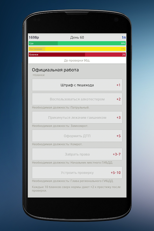 Симулятор гаишника - шуточное приложение симуляции жизни типичного гаишника. Не стоит воспринимать всё всерьез, но элементы правды не упущены:) Попытайтесь выжить как можно дольше, постоянно проходя проверки квалификации и останавливая всё больше и больше авто. Поднимайтесь по карьерной лестнице, улучшайте аксессуары и ваша жизнь превратится в сказку!