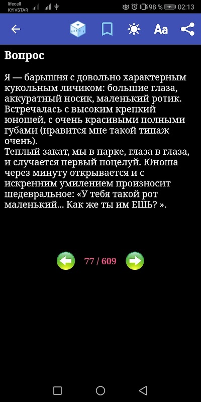 Die Anwendung unterstützt Nachtmodus und Offline-Modus (ohne das Internet), es gibt eine Suche. Lieblings interessante Geschichten können zu Favoriten hinzugefügt werden.