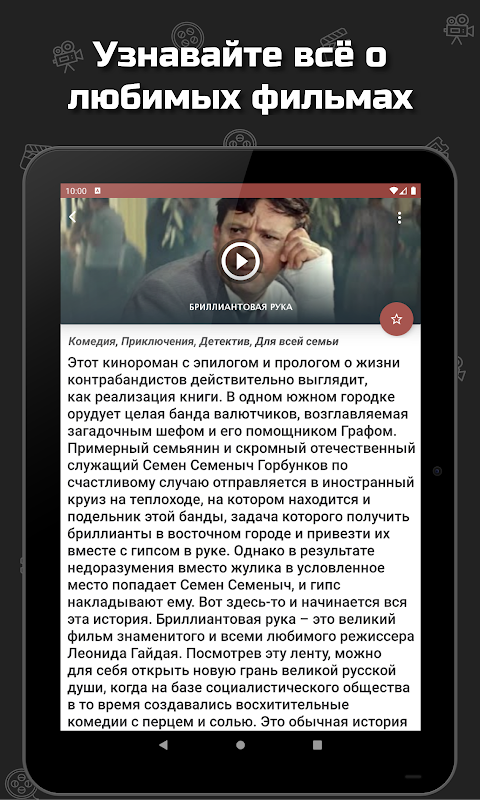 In der Anwendung "Sowjetische Filme" können Sie sowjetische Filme online ansehen oder eine Beschreibung davon lesen.