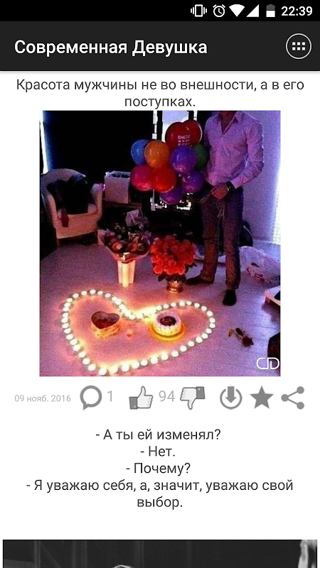 Понравившиеся записи можно комментировать и оценивать. Все понравившиеся картинки можно сохранять в галерее устройства в папке приложения. Ты можешь делиться записями с друзьями через социальные сети Facebook, Вконтакте, Одноклассники, Viber, WhatsApp а так же другие установленные на устройстве приложения. Ну и конечно, ты можешь оставлять лайки и сохранять записи в избранное.