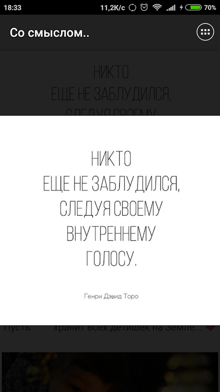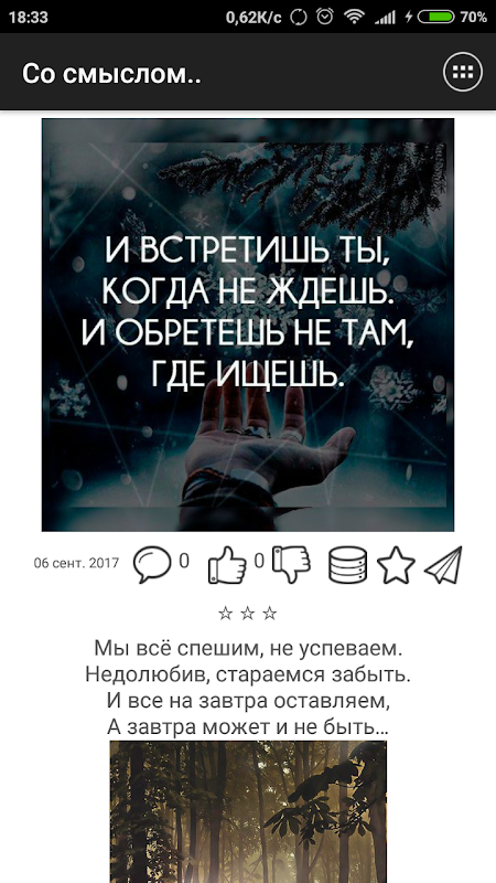 Вас интересуют приложения, в которых вы можете прочитать цитаты или факты, которые заставляют задуматься? Вам крупно повезло! "Со смыслом" - то, что вам надо! Удобный интерфейс - ничего лишнего. Здесь находится огромное количество интересных фактов, цитаты великих людей и просто цитаты, разных мыслей и истинных ситуаций. Наша коллекция интересных фактов, историй, мыслей и т.д. обновляется ежедневно. Так что заходи и начинай развиваться.😉