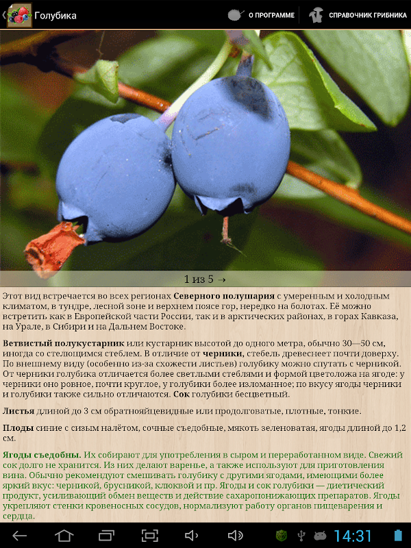 Verzeichnis enthält Informationen über verschiedene Parameter der Beeren, Fruchtkörper, sowie Informationen über die Genießbarkeit. Das Programm enthält 5+ Fotos von jedem berry verschiedenen Winkeln und Stadien der Entwicklung, die die Beeren genau zu identifizieren. Soeben einen kleinen Abschnitt über die Ernte der Beeren, die solche Möglichkeiten der Beschaffung als "raw" und Beeren Marmelade, Gelee-Beere, Beeren-Marmelade (Jam) und Beerenmarmelade berücksichtigt.