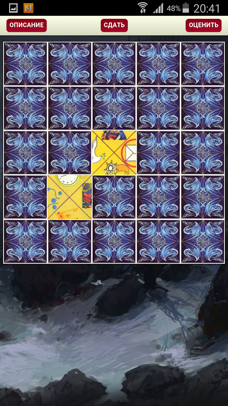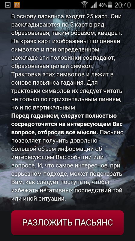 Этот необычный способ гадания, его называют Старинный пасьянс или Индийский пасьянс гадание. Это гадание раскладывали еще наши прабабушки и прадедушки. Пасьянс гадание отражает народные мудрости, символы его близки и понятны каждому человеку и идут из жизненных ситуаций. Пасьянс состоит из 25 карточек. Карточки раскладываются по пять карт в каждый ряд, получается, пять рядов по пять карт. По краям карточек расположены половинки различных символов. Иногда эти половинки совпадают, и образуется целый символ, трактовка совпавших символов и лежит в основе пасьянса гадания. Перед тем как разложить пасьянс, нужно полностью сосредоточиться на интересующей проблемой. При серьезном подходе, гадание подскажет вам, как нужно поступать, чтобы избежать неприятных последствий в той или иной ситуации.
