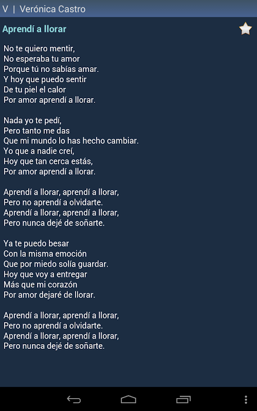 Приложение "Тексты песен на испанском" позволит вам в два клика увидеть текст любимой песни на испанском и наконец-то разобрать все слова! Просто выберите исполнителя и его песню и тут же перед вами отобразится ее текст песни на испанском.