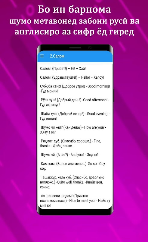 Мехоҳед забонҳои Русӣ ва Англисиро тез ва босифат омӯзед ва озодона сухан кунед? Пас ин барнома барои шумо аст. Муҳовараи хуби тоҷикӣ-русӣ-англисӣ бо транскрипти тоҷикӣ. Барнома 30 категорияро дарбар мегиранд