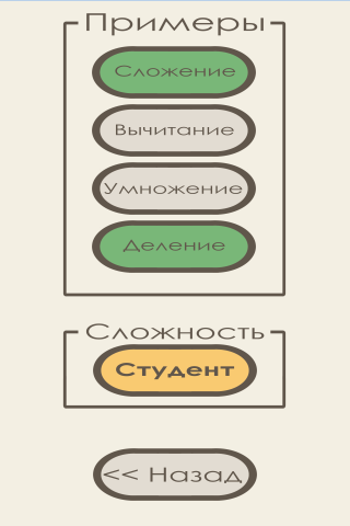"За определенный промежуток времени необходимо решить как можно больше примеров. Их сложность зависит от выбранного уровня. На решение каждого примера выделяется 10 секунд, если пример решается быстрее, то оставшиеся секунды прибавляются к основному времени! Если пример будет решен неверно, то секунды будут вычтены из основного времени, соответственно! За каждый правильный ответ игрок получает очки, которые эквивалентны времени, потраченному на решение примера. Уровень сложности, как и тип примеров, игрок может выбрать самостоятельно! Тренируйте память и устанавливайте новые рекорды!"