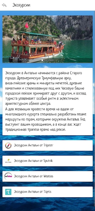 In der Anwendung können Sie die Städte der Türkei zum ersten Mal kennenlernen, ein Reiseziel auswählen, Sehenswürdigkeiten ansehen und Videobewertungen abgeben. Die Anwendung enthält auch Informationen über Ausflugsbüros, Reisebüros und Hotels, die ihre Dienste in der ausgewählten Stadt anbieten.