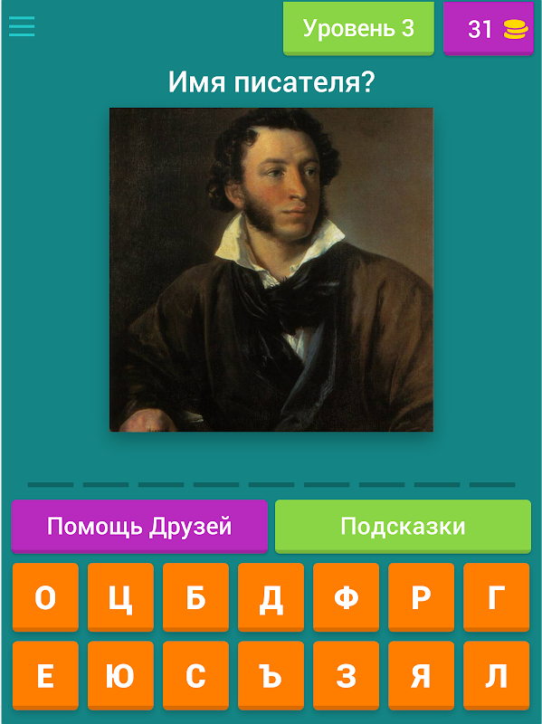 Увлекательное приложение «Угадай Русского Писателя» - отличный способ провести свободную минуту в любом месте: в транспорте, в очереди или сидя за столиком в кафе. Игра построена по принципу шоу «Поле Чудес» и подразумевает отгадывание слов - имён известных писателей. К услугам пользователя – подсказки, кнопка «Помощь Друзей» и деньги, используя которые можно показать одну из букв или перейти на следующий уровень.