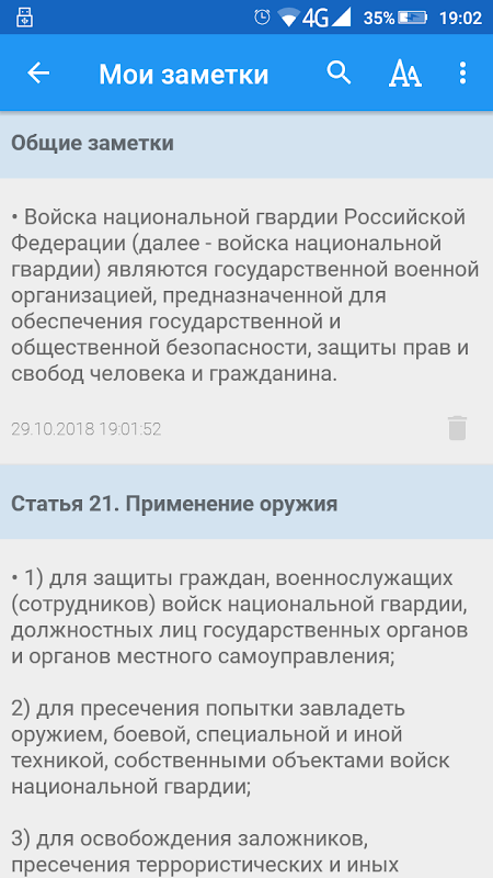 Die App ist ein praktischer Leitfaden zum Bundesgesetz über die Nationalgardetruppen. Der Antrag enthält den vollständigen Gesetzestext, der zu diesem Zeitpunkt relevant ist. Enthaltenes Dekret des Präsidenten der Russischen Föderation Nr. 510 und Anweisung zur Organisation des Dienstes (Order No. 420)