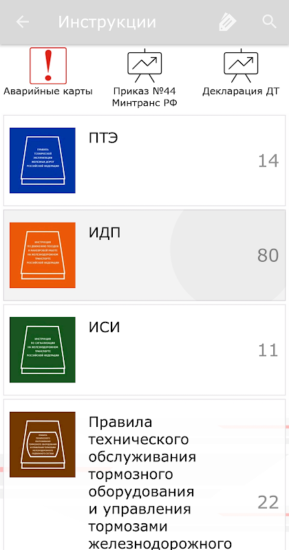 - отобран материал для быстрого поиска и навигации по основным инструкциям и распоряжениям в дирекции тяги (на момент публикации в приложении доступны следующие нормативные документы: ПТЭ, ИСИ, ИДП, 2714р, Л230, Правила 151, Распоряжения № 671р, №2580р, №2585р, 6р, Аварийные карты, Коллективный договор и др);